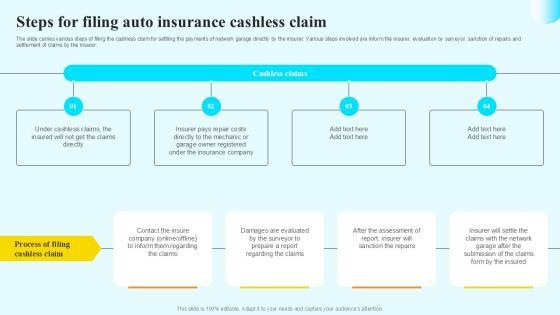 The slide carries various steps of filing the cashless claim for settling the payments of network garage directly by the insurer. Various steps involved are inform the insurer, evaluation by surveyor, sanction of repairs and settlement of claims by the insurer. Explore a selection of the finest Steps For Filing Auto Insurance Steps By Step Guide For Claiming Car PPT PowerPoint here. With a plethora of professionally designed and pre-made slide templates, you can quickly and easily find the right one for your upcoming presentation. You can use our Steps For Filing Auto Insurance Steps By Step Guide For Claiming Car PPT PowerPoint to effectively convey your message to a wider audience. Slidegeeks has done a lot of research before preparing these presentation templates. The content can be personalized and the slides are highly editable. Grab templates today from Slidegeeks. The slide carries various steps of filing the cashless claim for settling the payments of network garage directly by the insurer. Various steps involved are inform the insurer, evaluation by surveyor, sanction of repairs and settlement of claims by the insurer.