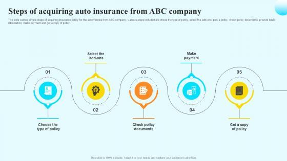 The slide carries simple steps of acquiring insurance policy for the automobiles from ABC company. Various steps included are chose the type of policy, select the add-ons, pick a policy, check policy documents, provide basic information, make payment and get a copy of policy. Are you searching for a Steps Of Acquiring Auto Insurance Steps By Step Guide For Claiming Car PPT Example that is uncluttered, straightforward, and original Its easy to edit, and you can change the colors to suit your personal or business branding. For a presentation that expresses how much effort you have put in, this template is ideal With all of its features, including tables, diagrams, statistics, and lists, its perfect for a business plan presentation. Make your ideas more appealing with these professional slides. Download Steps Of Acquiring Auto Insurance Steps By Step Guide For Claiming Car PPT Example from Slidegeeks today. The slide carries simple steps of acquiring insurance policy for the automobiles from ABC company. Various steps included are chose the type of policy, select the add-ons, pick a policy, check policy documents, provide basic information, make payment and get a copy of policy.