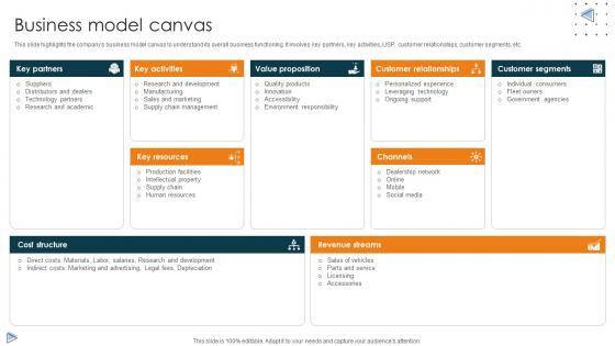 This slide highlights the companys business model canvas to understand its overall business functioning. It involves key partners, key activities, USP, customer relationships, customer segments, etc. Find a pre-designed and impeccable Business Model Canvas Car Manufacturing Company Business Model BMC SS V. The templates can ace your presentation without additional effort. You can download these easy-to-edit presentation templates to make your presentation stand out from others. So, what are you waiting for Download the template from Slidegeeks today and give a unique touch to your presentation. This slide highlights the companys business model canvas to understand its overall business functioning. It involves key partners, key activities, USP, customer relationships, customer segments, etc.