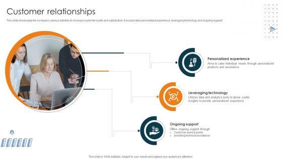 This slide showcases the companys various activities to increase customer loyalty and satisfaction. It incorporates personalized experience, leveraging technology and ongoing support. Slidegeeks is one of the best resources for PowerPoint templates. You can download easily and regulate Customer Relationships Car Manufacturing Company Business Model BMC SS V for your personal presentations from our wonderful collection. A few clicks is all it takes to discover and get the most relevant and appropriate templates. Use our Templates to add a unique zing and appeal to your presentation and meetings. All the slides are easy to edit and you can use them even for advertisement purposes. This slide showcases the companys various activities to increase customer loyalty and satisfaction. It incorporates personalized experience, leveraging technology and ongoing support.