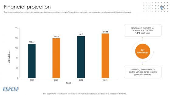 This slide presents the financial projections showcasing the companys anticipated growth. The predictions are based on comprehensive market analysis and historical performance. There are so many reasons you need a Financial Projection Car Manufacturing Company Business Model BMC SS V. The first reason is you can not spend time making everything from scratch, Thus, Slidegeeks has made presentation templates for you too. You can easily download these templates from our website easily. This slide presents the financial projections showcasing the companys anticipated growth. The predictions are based on comprehensive market analysis and historical performance.