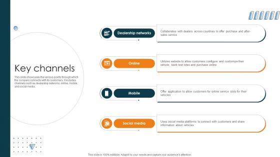 This slide showcases the various points through which the company connects with its customers. It includes channels such as dealership networks, online, mobile, and social media. From laying roadmaps to briefing everything in detail, our templates are perfect for you. You can set the stage with your presentation slides. All you have to do is download these easy-to-edit and customizable templates. Key Channels Car Manufacturing Company Business Model BMC SS V will help you deliver an outstanding performance that everyone would remember and praise you for. Do download this presentation today. This slide showcases the various points through which the company connects with its customers. It includes channels such as dealership networks, online, mobile, and social media.