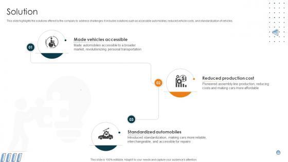 This slide highlights the solutions offered by the company to address challenges. It includes solutions such as accessible automobiles, reduced vehicle costs, and standardization of vehicles. If your project calls for a presentation, then Slidegeeks is your go-to partner because we have professionally designed, easy-to-edit templates that are perfect for any presentation. After downloading, you can easily edit Solution Car Manufacturing Company Business Model BMC SS V and make the changes accordingly. You can rearrange slides or fill them with different images. Check out all the handy templates This slide highlights the solutions offered by the company to address challenges. It includes solutions such as accessible automobiles, reduced vehicle costs, and standardization of vehicles.