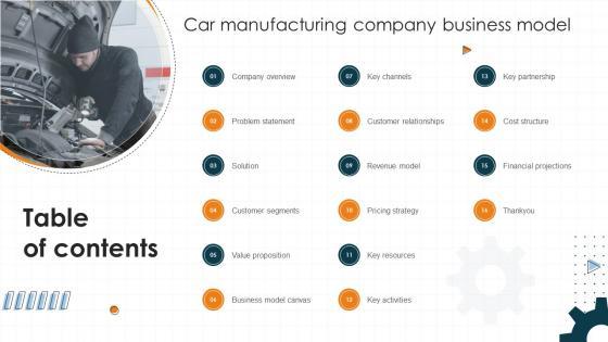If you are looking for a format to display your unique thoughts, then the professionally designed Table Of Contents Car Manufacturing Company Business Model BMC SS V is the one for you. You can use it as a Google Slides template or a PowerPoint template. Incorporate impressive visuals, symbols, images, and other charts. Modify or reorganize the text boxes as you desire. Experiment with shade schemes and font pairings. Alter, share or cooperate with other people on your work. Download Table Of Contents Car Manufacturing Company Business Model BMC SS V and find out how to give a successful presentation. Present a perfect display to your team and make your presentation unforgettable. Our Table Of Contents Car Manufacturing Company Business Model BMC SS V are topically designed to provide an attractive backdrop to any subject. Use them to look like a presentation pro.