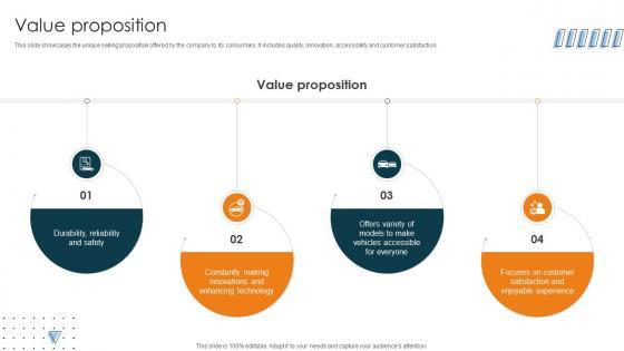 This slide showcases the unique selling proposition offered by the company to its consumers. It includes quality, innovation, accessibility and customer satisfaction. Are you in need of a template that can accommodate all of your creative concepts This one is crafted professionally and can be altered to fit any style. Use it with Google Slides or PowerPoint. Include striking photographs, symbols, depictions, and other visuals. Fill, move around, or remove text boxes as desired. Test out color palettes and font mixtures. Edit and save your work, or work with colleagues. Download Value Proposition Car Manufacturing Company Business Model BMC SS V and observe how to make your presentation outstanding. Give an impeccable presentation to your group and make your presentation unforgettable. This slide showcases the unique selling proposition offered by the company to its consumers. It includes quality, innovation, accessibility and customer satisfaction.