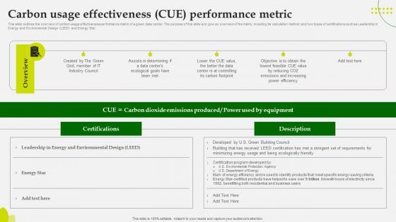 This slide outlines the overview of carbon usage effectiveness performance matric of a green data center. The purpose of this slide is to give an overview of the metric, including its calculation method and two types of certifications such as Leadership in Energy and Environmental Design LEED and Energy Star.Create an editable Carbon Usage Effectiveness Cue Performance Metric Eco Friendly Computing IT that communicates your idea and engages your audience. Whether you are presenting a business or an educational presentation, pre-designed presentation templates help save time. Carbon Usage Effectiveness Cue Performance Metric Eco Friendly Computing IT is highly customizable and very easy to edit, covering many different styles from creative to business presentations. Slidegeeks has creative team members who have crafted amazing templates. So, go and get them without any delay. This slide outlines the overview of carbon usage effectiveness performance matric of a green data center. The purpose of this slide is to give an overview of the metric, including its calculation method and two types of certifications such as Leadership in Energy and Environmental Design ,LEED and Energy Star.