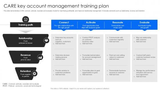 This slide demonstrates CARE connect, activate, resonate and evaluate model for maximizing profitability and improved relationship management. It includes elements such as relationship, revenue and retention. Here you can discover an assortment of the finest PowerPoint and Google Slides templates. With these templates, you can create presentations for a variety of purposes while simultaneously providing your audience with an eye-catching visual experience. Download CARE Key Account Management Training Plan PPT Template SS to deliver an impeccable presentation. These templates will make your job of preparing presentations much quicker, yet still, maintain a high level of quality. Slidegeeks has experienced researchers who prepare these templates and write high-quality content for you. Later on, you can personalize the content by editing the CARE Key Account Management Training Plan PPT Template SS. This slide demonstrates CARE connect, activate, resonate and evaluate model for maximizing profitability and improved relationship management. It includes elements such as relationship, revenue and retention.