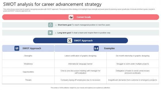 This slide shows career plan for graphic designing executive with SWOT approach. The purpose of this strategy is to highlight major strength and weak areas for planning career growth plan. It include short term goals, long term goals and SWOT analysis approach, etc. Showcasing this set of slides titled SWOT Analysis For Career Advancement Strategy Graphics Pdf. The topics addressed in these templates are Approach, Examples. All the content presented in this PPT design is completely editable. Download it and make adjustments in color, background, font etc. as per your unique business setting. This slide shows career plan for graphic designing executive with SWOT approach. The purpose of this strategy is to highlight major strength and weak areas for planning career growth plan. It include short term goals, long term goals and SWOT analysis approach, etc.