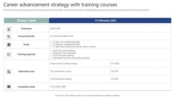 This slide shows comprehensive growth plan for an individual with current job title. The purpose of this slide is to highlight professional goals, trainings required and estimation cost for career growth, etc. Pitch your topic with ease and precision using this Career Advancement Strategy With Training Courses Rules Pdf. This layout presents information on Employee, Current Job Title, Goals. It is also available for immediate download and adjustment. So, changes can be made in the color, design, graphics or any other component to create a unique layout. This slide shows comprehensive growth plan for an individual with current job title. The purpose of this slide is to highlight professional goals, trainings required and estimation cost for career growth, etc.