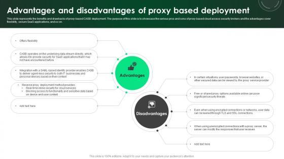 This slide represents the benefits and drawbacks of proxy-based CASB deployment. The purpose of this slide is to showcase the various pros and cons of proxy-based cloud access security brokers and the advantages cover flexibility, secure SaaS applications, and so on. Create an editable CASB 2 0 IT Advantages And Disadvantages Of Proxy Based Deployment that communicates your idea and engages your audience. Whether you are presenting a business or an educational presentation, pre-designed presentation templates help save time. CASB 2 0 IT Advantages And Disadvantages Of Proxy Based Deployment is highly customizable and very easy to edit, covering many different styles from creative to business presentations. Slidegeeks has creative team members who have crafted amazing templates. So, go and get them without any delay. This slide represents the benefits and drawbacks of proxy-based CASB deployment. The purpose of this slide is to showcase the various pros and cons of proxy-based cloud access security brokers and the advantages cover flexibility, secure SaaS applications, and so on.