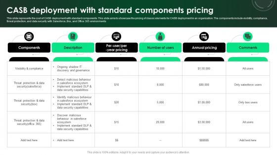 This slide represents the cost of CASB deployment with standard components. This slide aims to showcase the pricing of classic elements for CASB deployment in an organization. The components include visibility, compliance, threat protection, and data security with Salesforce, Box, and Office 365 environments. Whether you have daily or monthly meetings, a brilliant presentation is necessary. CASB 2 0 IT CASB Deployment With Standard Components Pricing can be your best option for delivering a presentation. Represent everything in detail using CASB 2 0 IT CASB Deployment With Standard Components Pricing and make yourself stand out in meetings. The template is versatile and follows a structure that will cater to your requirements. All the templates prepared by Slidegeeks are easy to download and edit. Our research experts have taken care of the corporate themes as well. So, give it a try and see the results. This slide represents the cost of CASB deployment with standard components. This slide aims to showcase the pricing of classic elements for CASB deployment in an organization. The components include visibility, compliance, threat protection, and data security with Salesforce, Box, and Office 365 environments