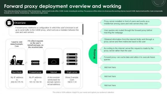 This slide describes the overview of the forward proxy deployment mode of the CASB model, including its working. The purpose of this slide is to showcase the working of proxy-based CASB deployment and the main components include user or clients, forward proxy, internet and origin server. Create an editable CASB 2 0 IT Forward Proxy Deployment Overview And Working that communicates your idea and engages your audience. Whether you are presenting a business or an educational presentation, pre-designed presentation templates help save time. CASB 2 0 IT Forward Proxy Deployment Overview And Working is highly customizable and very easy to edit, covering many different styles from creative to business presentations. Slidegeeks has creative team members who have crafted amazing templates. So, go and get them without any delay. This slide describes the overview of the forward proxy deployment mode of the CASB model, including its working. The purpose of this slide is to showcase the working of proxy-based CASB deployment and the main components include user or clients, forward proxy, internet and origin server.