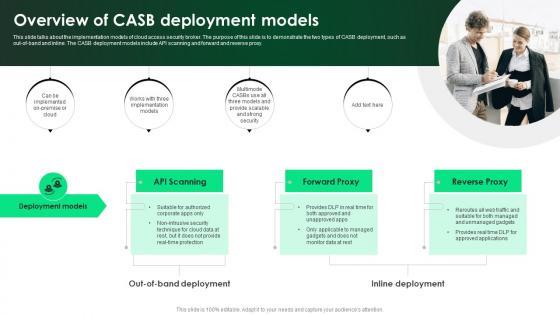 This slide talks about the implementation models of cloud access security broker. The purpose of this slide is to demonstrate the two types of CASB deployment, such as out-of-band and inline. The CASB deployment models include API scanning and forward and reverse proxy. Do you have to make sure that everyone on your team knows about any specific topic I yes, then you should give CASB 2 0 IT Overview Of CASB Deployment Models a try. Our experts have put a lot of knowledge and effort into creating this impeccable CASB 2 0 IT Overview Of CASB Deployment Models. You can use this template for your upcoming presentations, as the slides are perfect to represent even the tiniest detail. You can download these templates from the Slidegeeks website and these are easy to edit. So grab these today This slide talks about the implementation models of cloud access security broker. The purpose of this slide is to demonstrate the two types of CASB deployment, such as out-of-band and inline. The CASB deployment models include API scanning and forward and reverse proxy.