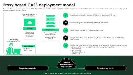 This slide outlines the overview of proxy-based CASB deployment. The purpose of this slide is to highlight the proxy-based implementation of the CASB model and it also includes the fundamental modes of proxy deployment, including forward proxy and reverse proxy. Do you have an important presentation coming up Are you looking for something that will make your presentation stand out from the rest Look no further than CASB 2 0 IT Proxy Based CASB Deployment Model. With our professional designs, you can trust that your presentation will pop and make delivering it a smooth process. And with Slidegeeks, you can trust that your presentation will be unique and memorable. So why wait Grab CASB 2 0 IT Proxy Based CASB Deployment Model today and make your presentation stand out from the rest This slide outlines the overview of proxy-based CASB deployment. The purpose of this slide is to highlight the proxy-based implementation of the CASB model and it also includes the fundamental modes of proxy deployment, including forward proxy and reverse proxy.