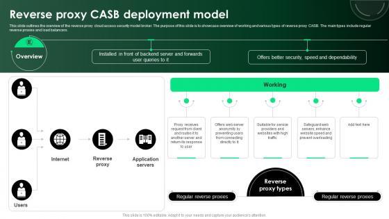 This slide outlines the overview of the reverse proxy cloud access security model broker. The purpose of this slide is to showcase overview of working and various types of reverse proxy CASB. The main types include regular reverse proxies and load balancers. If your project calls for a presentation, then Slidegeeks is your go-to partner because we have professionally designed, easy-to-edit templates that are perfect for any presentation. After downloading, you can easily edit CASB 2 0 IT Reverse Proxy CASB Deployment Model and make the changes accordingly. You can rearrange slides or fill them with different images. Check out all the handy templates This slide outlines the overview of the reverse proxy cloud access security model broker. The purpose of this slide is to showcase overview of working and various types of reverse proxy CASB. The main types include regular reverse proxies and load balancers.