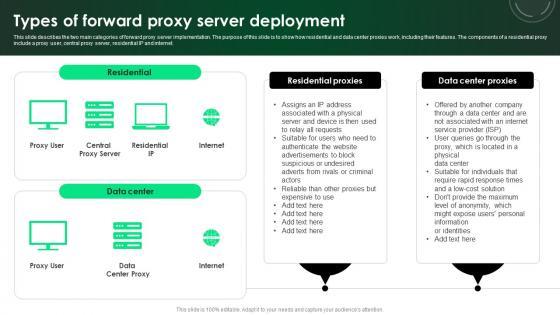 This slide describes the two main categories of forward proxy server implementation. The purpose of this slide is to show how residential and data center proxies work, including their features. The components of a residential proxy include a proxy user, central proxy server, residential IP and internet. Coming up with a presentation necessitates that the majority of the effort goes into the content and the message you intend to convey. The visuals of a PowerPoint presentation can only be effective if it supplements and supports the story that is being told. Keeping this in mind our experts created CASB 2 0 IT Types Of Forward Proxy Server Deployment to reduce the time that goes into designing the presentation. This way, you can concentrate on the message while our designers take care of providing you with the right template for the situation. This slide describes the two main categories of forward proxy server implementation. The purpose of this slide is to show how residential and data center proxies work, including their features. The components of a residential proxy include a proxy user, central proxy server, residential IP and internet.