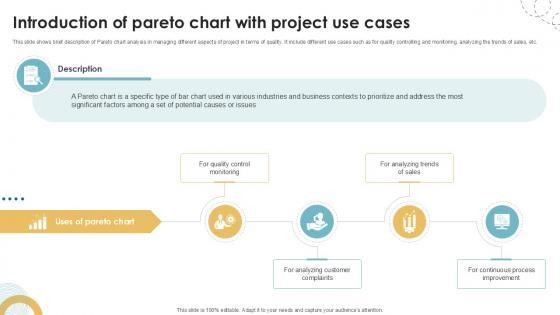 This slide shows brief description of Pareto chart analysis in managing different aspects of project in terms of quality. It include different use cases such as for quality controlling and monitoring, analyzing the trends of sales, etc. The best PPT templates are a great way to save time, energy, and resources. Slidegeeks have 100 percent editable powerpoint slides making them incredibly versatile. With these quality presentation templates, you can create a captivating and memorable presentation by combining visually appealing slides and effectively communicating your message. Download Introduction Of Pareto Chart With Project Use Cases Executing Quality Ppt Slides PM SS V from Slidegeeks and deliver a wonderful presentation. This slide shows brief description of Pareto chart analysis in managing different aspects of project in terms of quality. It include different use cases such as for quality controlling and monitoring, analyzing the trends of sales, etc.