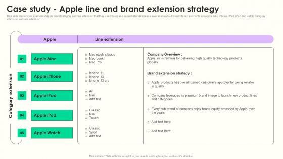 This slide showcases example of apple brand category and line extension that they used to expand in market and increase awareness about brand. Its key elements are Apple mac, iPhone, iPad, iPod and watch, category extension and line extension Presenting this PowerPoint presentation, titled Case Study Apple Line Maximizing Sales Via Online Brand Marketing Strategies Template Pdf, with topics curated by our researchers after extensive research. This editable presentation is available for immediate download and provides attractive features when used. Download now and captivate your audience. Presenting this Case Study Apple Line Maximizing Sales Via Online Brand Marketing Strategies Template Pdf. Our researchers have carefully researched and created these slides with all aspects taken into consideration. This is a completely customizable Case Study Apple Line Maximizing Sales Via Online Brand Marketing Strategies Template Pdf that is available for immediate downloading. Download now and make an impact on your audience. Highlight the attractive features available with our PPTs. This slide showcases example of apple brand category and line extension that they used to expand in market and increase awareness about brand. Its key elements are Apple mac, iPhone, iPad, iPod and watch, category extension and line extension