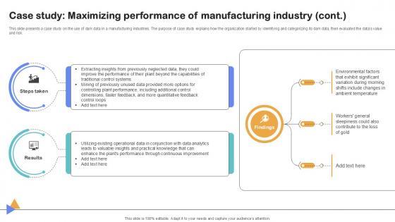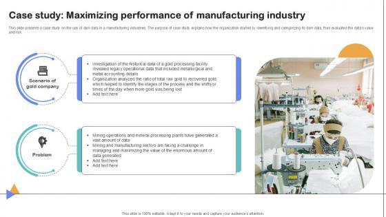 This slide presents a case study on the use of dark data in a manufacturing industries. The purpose of case study explains how the organization started by identifying and categorizing its dark data, then evaluated the datas value and risk.Want to ace your presentation in front of a live audience Our Case Study Maximizing Performance Importance Of Unstructured Data Ppt Presentation can help you do that by engaging all the users towards you. Slidegeeks experts have put their efforts and expertise into creating these impeccable powerpoint presentations so that you can communicate your ideas clearly. Moreover, all the templates are customizable, and easy-to-edit and downloadable. Use these for both personal and commercial use. This slide presents a case study on the use of dark data in a manufacturing industries. The purpose of case study explains how the organization started by identifying and categorizing its dark data, then evaluated the datas value and risk.