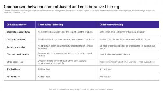 This slide compares the most widely used content based and collaborative filtering techniques on the basis of various aspects. These factors are information about items, cold start problem, domain knowledge, discover new interests and other users data. If your project calls for a presentation, then Slidegeeks is your go to partner because we have professionally designed, easy to edit templates that are perfect for any presentation. After downloading, you can easily edit Comparison Between Content Based Collaborative Use Cases Of Filtering Methods Introduction Pdf and make the changes accordingly. You can rearrange slides or fill them with different images. Check out all the handy templates This slide compares the most widely used content based and collaborative filtering techniques on the basis of various aspects. These factors are information about items, cold start problem, domain knowledge, discover new interests and other users data.