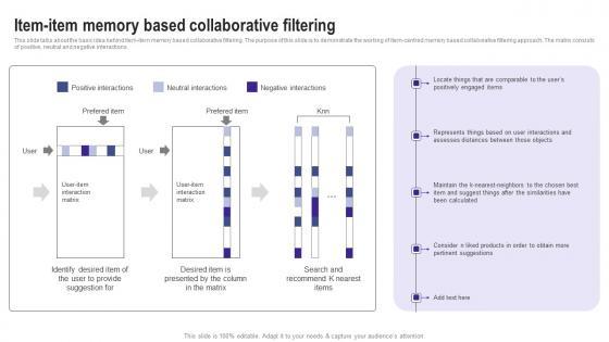 This slide talks about the basic idea behind item item memory based collaborative filtering. The purpose of this slide is to demonstrate the working of item centred memory based collaborative filtering approach. The matrix consists of positive, neutral and negative interactions. Find a pre designed and impeccable Item Item Memory Based Collaborative Filtering Use Cases Of Filtering Methods Introduction Pdf. The templates can ace your presentation without additional effort. You can download these easy to edit presentation templates to make your presentation stand out from others. So, what are you waiting for Download the template from Slidegeeks today and give a unique touch to your presentation. This slide talks about the basic idea behind item item memory based collaborative filtering. The purpose of this slide is to demonstrate the working of item centred memory based collaborative filtering approach. The matrix consists of positive, neutral and negative interactions.