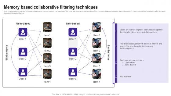 This slide talks about the memory based collaborative filtering method. The purpose of this slide is to provide the visualization of two memory based collaborative filtering techniques. These methods include user based and item based collaborative filtering. Slidegeeks is one of the best resources for PowerPoint templates. You can download easily and regulate Memory Based Collaborative Filtering Techniques Use Cases Of Filtering Methods Rules Pdf for your personal presentations from our wonderful collection. A few clicks is all it takes to discover and get the most relevant and appropriate templates. Use our Templates to add a unique zing and appeal to your presentation and meetings. All the slides are easy to edit and you can use them even for advertisement purposes. This slide talks about the memory based collaborative filtering method. The purpose of this slide is to provide the visualization of two memory based collaborative filtering techniques. These methods include user based and item based collaborative filtering.