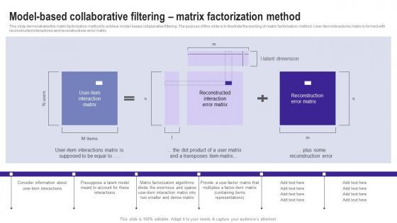 This slide demonstrates the matrix factorization method to achieve model based collaborative filtering. The purpose of this slide is to illustrate the working of matrix factorization method. User item interactions matrix is formed with reconstructed interactions and reconstructions error matrix. Want to ace your presentation in front of a live audience Our Model Based Collaborative Filtering Matrix Factorization Use Cases Of Filtering Methods Mockup Pdf can help you do that by engaging all the users towards you. Slidegeeks experts have put their efforts and expertise into creating these impeccable powerpoint presentations so that you can communicate your ideas clearly. Moreover, all the templates are customizable, and easy to edit and downloadable. Use these for both personal and commercial use. This slide demonstrates the matrix factorization method to achieve model based collaborative filtering. The purpose of this slide is to illustrate the working of matrix factorization method. User item interactions matrix is formed with reconstructed interactions and reconstructions error matrix.