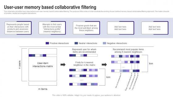 This slide talks about the basic idea behind user user memory based collaborative filtering. The purpose of this slide is to demonstrate the working of user centred memory based collaborative filtering approach. The matrix consists of positive, neutral and negative interactions. Slidegeeks has constructed User User Memory Based Collaborative Filtering Use Cases Of Filtering Methods Background Pdf after conducting extensive research and examination. These presentation templates are constantly being generated and modified based on user preferences and critiques from editors. Here, you will find the most attractive templates for a range of purposes while taking into account ratings and remarks from users regarding the content. This is an excellent jumping off point to explore our content and will give new users an insight into our top notch PowerPoint Templates. This slide talks about the basic idea behind user user memory based collaborative filtering. The purpose of this slide is to demonstrate the working of user centred memory based collaborative filtering approach. The matrix consists of positive, neutral and negative interactions.