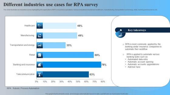 The slide illustrates an industrial survey highlighting the application of RPA in business operations. Various industries included are healthcare, manufacturing, transportation and energy, retail, banking and insurance, etc. Pitch your topic with ease and precision using this Different Industries Use Cases For RPA Survey Sample Pdf This layout presents information on Different Industries, Cases For RPA Survey It is also available for immediate download and adjustment. So, changes can be made in the color, design, graphics or any other component to create a unique layout. The slide illustrates an industrial survey highlighting the application of RPA in business operations. Various industries included are healthcare, manufacturing, transportation and energy, retail, banking and insurance, etc.