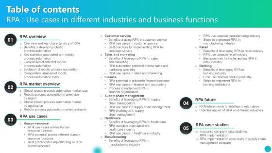 From laying roadmaps to briefing everything in detail, our templates are perfect for you. You can set the stage with your presentation slides. All you have to do is download these easy-to-edit and customizable templates. Table Of Content RPA Use Cases In Different Industries And Business PPT Sample AI SS V will help you deliver an outstanding performance that everyone would remember and praise you for. Do download this presentation today. Our Table Of Content RPA Use Cases In Different Industries And Business PPT Sample AI SS V are topically designed to provide an attractive backdrop to any subject. Use them to look like a presentation pro.
