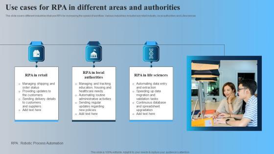 The slide covers different industries that use RPA for increasing the speed of workflow. Various industries included are retail industry, local authorities and Lifesciences Showcasing this set of slides titled Use Cases For RPA In Different Areas And Authorities Graphics Pdf. The topics addressed in these templates are RPA In Retail, RPA In Local Authorities, RPA In Life Sciences. All the content presented in this PPT design is completely editable. Download it and make adjustments in color, background, font etc. as per your unique business setting. The slide covers different industries that use RPA for increasing the speed of workflow. Various industries included are retail industry, local authorities and Lifesciences