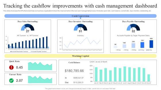 This slide showcases the KPIs that would help our business organization to track the improvements in the new cash management process. It includes quick ratio, cash balance, current ratio, days inventory outstanding, etc. Slidegeeks is one of the best resources for PowerPoint templates. You can download easily and regulate Strategic Financial Planning And Administration Tracking The Cashflow Improvements Cash Themes PDF for your personal presentations from our wonderful collection. A few clicks is all it takes to discover and get the most relevant and appropriate templates. Use our Templates to add a unique zing and appeal to your presentation and meetings. All the slides are easy to edit and you can use them even for advertisement purposes. This slide showcases the KPIs that would help our business organization to track the improvements in the new cash management process. It includes quick ratio, cash balance, current ratio, days inventory outstanding, etc.