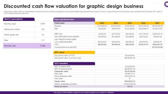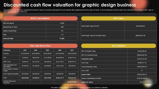 The purpose of this slide is to calculate the amount of money an investor would get from an investment after adjusting for the time value of money. It covers things like risk-free return, free cash flow to the company, NPV value of FCFF and terminal year, and so on. From laying roadmaps to briefing everything in detail, our templates are perfect for you. You can set the stage with your presentation slides. All you have to do is download these easy-to-edit and customizable templates. Creative Agency Business Plan Discounted Cash Flow Valuation For Graphic Design Business BP SS V will help you deliver an outstanding performance that everyone would remember and praise you for. Do download this presentation today. The purpose of this slide is to calculate the amount of money an investor would get from an investment after adjusting for the time value of money. It covers things like risk-free return, free cash flow to the company, NPV value of FCFF and terminal year, and so on.