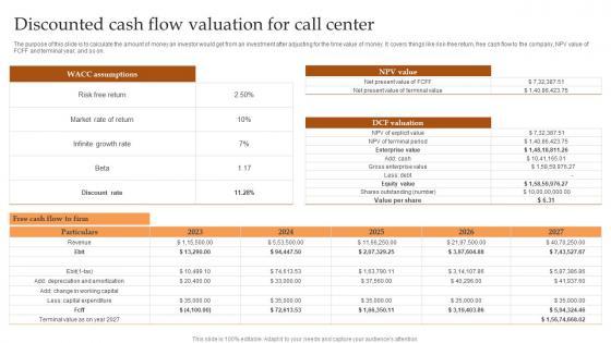 The purpose of this slide is to calculate the amount of money an investor would get from an investment after adjusting for the time value of money. It covers things like risk-free return, free cash flow to the company, NPV value of FCFF and terminal year, and so on. Explore a selection of the finest Discounted Cash Flow Valuation For Call Center IT And Tech Support Business Topics Pdf here. With a plethora of professionally designed and pre-made slide templates, you can quickly and easily find the right one for your upcoming presentation. You can use our Discounted Cash Flow Valuation For Call Center IT And Tech Support Business Topics Pdf to effectively convey your message to a wider audience. Slidegeeks has done a lot of research before preparing these presentation templates. The content can be personalized and the slides are highly editable. Grab templates today from Slidegeeks. The purpose of this slide is to calculate the amount of money an investor would get from an investment after adjusting for the time value of money. It covers things like risk-free return, free cash flow to the company, NPV value of FCFF and terminal year, and so on.