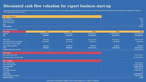 The purpose of this slide is to calculate the amount of money an investor would get from an investment after adjusting for the time value of money. It covers things like risk-free return, free cash flow to the company, NPV value of FCFF and terminal year, and so on. From laying roadmaps to briefing everything in detail, our templates are perfect for you. You can set the stage with your presentation slides. All you have to do is download these easy-to-edit and customizable templates. Discounted Cash Flow Valuation For Export Business Start Up Export Business Plan Download Pdf will help you deliver an outstanding performance that everyone would remember and praise you for. Do download this presentation today. The purpose of this slide is to calculate the amount of money an investor would get from an investment after adjusting for the time value of money. It covers things like risk-free return, free cash flow to the company, NPV value of FCFF and terminal year, and so on.