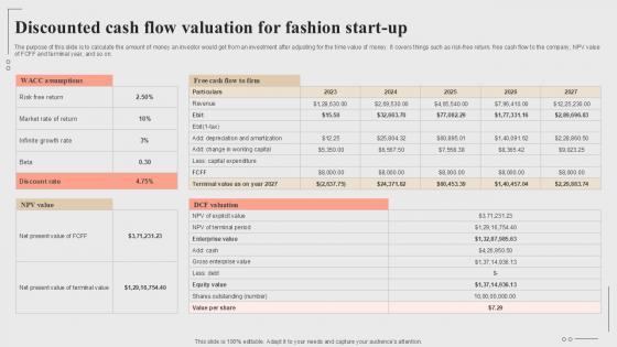 The purpose of this slide is to calculate the amount of money an investor would get from an investment after adjusting for the time value of money. It covers things such as risk-free return, free cash flow to the company, NPV value of FCFF and terminal year, and so on. Do you have to make sure that everyone on your team knows about any specific topic I yes, then you should give Discounted Cash Flow Valuation For Fashion Start Up Fashion Startup Roadmap Plan Ppt Example BP SS V a try. Our experts have put a lot of knowledge and effort into creating this impeccable Discounted Cash Flow Valuation For Fashion Start Up Fashion Startup Roadmap Plan Ppt Example BP SS V You can use this template for your upcoming presentations, as the slides are perfect to represent even the tiniest detail. You can download these templates from the Slidegeeks website and these are easy to edit. So grab these today The purpose of this slide is to calculate the amount of money an investor would get from an investment after adjusting for the time value of money. It covers things such as risk-free return, free cash flow to the company, NPV value of FCFF and terminal year, and so on.