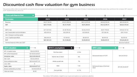 The purpose of this slide is to calculate the amount of money an investor would get from an investment after adjusting for the time value of money. It covers things like risk-free return, free cash flow to the company, NPV value of FCFF and terminal year, and so on. Find highly impressive Discounted Cash Flow Valuation For Gym Business Fitness Center Business Plan Topics Pdf on Slidegeeks to deliver a meaningful presentation. You can save an ample amount of time using these presentation templates. No need to worry to prepare everything from scratch because Slidegeeks experts have already done a huge research and work for you. You need to download Discounted Cash Flow Valuation For Gym Business Fitness Center Business Plan Topics Pdf for your upcoming presentation. All the presentation templates are 100 percent editable and you can change the color and personalize the content accordingly. Download now. The purpose of this slide is to calculate the amount of money an investor would get from an investment after adjusting for the time value of money. It covers things like risk-free return, free cash flow to the company, NPV value of FCFF and terminal year, and so on.