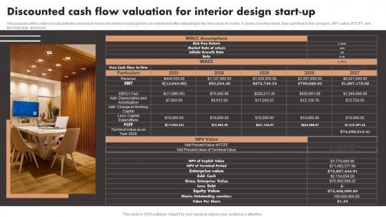 The purpose of this slide is to calculate the amount of money an investor would get from an investment after adjusting for the time value of money. It covers risk-free return, free cash flow to the company, NPV value of FCFF and terminal year, and so on. Explore a selection of the finest Discounted Cash Flow Valuation For Interior Design Start Up Luxury Interior Design Microsoft Pdf here. With a plethora of professionally designed and pre-made slide templates, you can quickly and easily find the right one for your upcoming presentation. You can use our Discounted Cash Flow Valuation For Interior Design Start Up Luxury Interior Design Microsoft Pdf to effectively convey your message to a wider audience. Slidegeeks has done a lot of research before preparing these presentation templates. The content can be personalized and the slides are highly editable. Grab templates today from Slidegeeks. The purpose of this slide is to calculate the amount of money an investor would get from an investment after adjusting for the time value of money. It covers risk-free return, free cash flow to the company, NPV value of FCFF and terminal year, and so on.