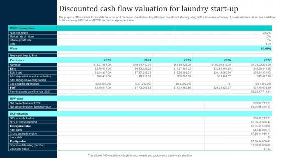 Present like a pro with Discounted Cash Flow Valuation For On Demand Laundry Business Plan Background Pdf Create beautiful presentations together with your team, using our easy to use presentation slides. Share your ideas in real time and make changes on the fly by downloading our templates. So whether you are in the office, on the go, or in a remote location, you can stay in sync with your team and present your ideas with confidence. With Slidegeeks presentation got a whole lot easier. Grab these presentations today. The purpose of this slide is to calculate the amount of money an investor would get from an investment after adjusting for the time value of money. It covers risk free return, free cash flow to the company, NPV value of FCFF and terminal year, and so on.
