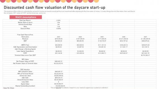 The purpose of this slide is to calculate the amount of money an investor would get from an investment after adjusting for the time value of money. It covers things like risk-free return, free cash flow to the company, NPV value of FCFF and terminal year, and so on.Find highly impressive Discounted Cash Flow Valuation Of The Daycare Start Up Childcare Business Plan Graphics Pdf on Slidegeeks to deliver a meaningful presentation. You can save an ample amount of time using these presentation templates. No need to worry to prepare everything from scratch because Slidegeeks experts have already done a huge research and work for you. You need to download Discounted Cash Flow Valuation Of The Daycare Start Up Childcare Business Plan Graphics Pdf for your upcoming presentation. All the presentation templates are 100 percent editable and you can change the color and personalize the content accordingly. Download now The purpose of this slide is to calculate the amount of money an investor would get from an investment after adjusting for the time value of money. It covers things like risk-free return, free cash flow to the company, NPV value of FCFF and terminal year, and so on.