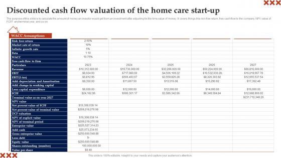 The purpose of this slide is to calculate the amount of money an investor would get from an investment after adjusting for the time value of money. It covers things like risk-free return, free cash flow to the company, NPV value of FCFF and terminal year, and so on. Do you have an important presentation coming up Are you looking for something that will make your presentation stand out from the rest Look no further than Go To Market Strategy Discounted Cash Flow Valuation Of The Home Care Start Up Designs Pdf With our professional designs, you can trust that your presentation will pop and make delivering it a smooth process. And with Slidegeeks, you can trust that your presentation will be unique and memorable. So why wait Grab Go To Market Strategy Discounted Cash Flow Valuation Of The Home Care Start Up Designs Pdf today and make your presentation stand out from the rest. The purpose of this slide is to calculate the amount of money an investor would get from an investment after adjusting for the time value of money. It covers things like risk-free return, free cash flow to the company, NPV value of FCFF and terminal year, and so on.