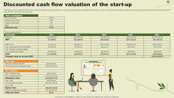 This slide is used to determine how much money an investor would receive from a certain investment after accounting for time value of money. It includes information on topics like risk-free return, free cash flow to the business, NPV value of FCFF, terminal year, and more. Slidegeeks is here to make your presentations a breeze with Lawn Care Services Business Plan Discounted Cash Flow Valuation Of The Start Up BP SS V With our easy-to-use and customizable templates, you can focus on delivering your ideas rather than worrying about formatting. With a variety of designs to choose from, you are sure to find one that suits your needs. And with animations and unique photos, illustrations, and fonts, you can make your presentation pop. So whether you are giving a sales pitch or presenting to the board, make sure to check out Slidegeeks first This slide is used to determine how much money an investor would receive from a certain investment after accounting for time value of money. It includes information on topics like risk-free return, free cash flow to the business, NPV value of FCFF, terminal year, and more.