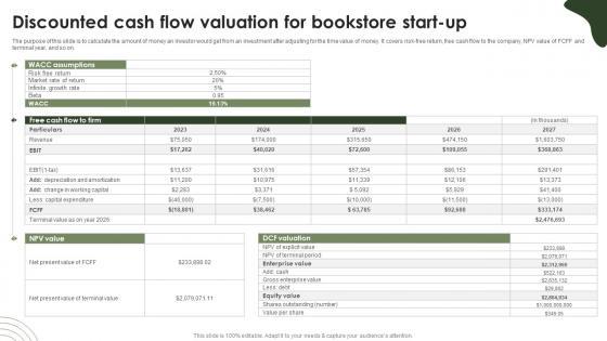 The purpose of this slide is to calculate the amount of money an investor would get from an investment after adjusting for the time value of money. It covers risk-free return, free cash flow to the company, NPV value of FCFF and terminal year, and so on. Do you have an important presentation coming up Are you looking for something that will make your presentation stand out from the rest Look no further than Online Bookstore Business Plan Discounted Cash Flow Valuation For Bookstore Start Up BP SS V. With our professional designs, you can trust that your presentation will pop and make delivering it a smooth process. And with Slidegeeks, you can trust that your presentation will be unique and memorable. So why wait Grab Online Bookstore Business Plan Discounted Cash Flow Valuation For Bookstore Start Up BP SS V today and make your presentation stand out from the rest The purpose of this slide is to calculate the amount of money an investor would get from an investment after adjusting for the time value of money. It covers risk-free return, free cash flow to the company, NPV value of FCFF and terminal year, and so on.