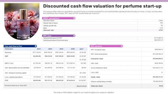 The purpose of this slide is to calculate the amount of money an investor would get from an investment after adjusting for the time value of money. It covers risk-free return, free cash flow to the company, NPV value of FCFF and terminal year, and so on. From laying roadmaps to briefing everything in detail, our templates are perfect for you. You can set the stage with your presentation slides. All you have to do is download these easy-to-edit and customizable templates. Perfume Manufacturing Business Plan Discounted Cash Flow Valuation For Perfume Start Up BP SS V will help you deliver an outstanding performance that everyone would remember and praise you for. Do download this presentation today. The purpose of this slide is to calculate the amount of money an investor would get from an investment after adjusting for the time value of money. It covers risk-free return, free cash flow to the company, NPV value of FCFF and terminal year, and so on.