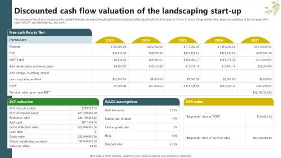 The purpose of this slide is to calculate the amount of money an investor would get from an investment after adjusting for the time value of money. It covers things like risk-free return, free cash flow to the company, NPV value of FCFF and terminal year, and so on. Do you have an important presentation coming up Are you looking for something that will make your presentation stand out from the rest Look no further than Discounted Cash Flow Valuation Of The Landscaping Start Up Lawn Care BP SS V. With our professional designs, you can trust that your presentation will pop and make delivering it a smooth process. And with Slidegeeks, you can trust that your presentation will be unique and memorable. So why wait Grab Discounted Cash Flow Valuation Of The Landscaping Start Up Lawn Care BP SS V today and make your presentation stand out from the rest The purpose of this slide is to calculate the amount of money an investor would get from an investment after adjusting for the time value of money. It covers things like risk-free return, free cash flow to the company, NPV value of FCFF and terminal year, and so on.