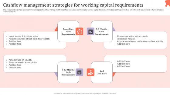 This slide provides glimpse about common strategies of cashflow management that can help our business in managing working capital. It includes immediate cash requirements, 3-6 months cash requirements, 6-12 months cash requirements, etc.Presenting this PowerPoint presentation, titled Cashflow Management Strategies For Working Capital Requirements Sample PDF, with topics curated by our researchers after extensive research. This editable presentation is available for immediate download and provides attractive features when used. Download now and captivate your audience. Presenting this Cashflow Management Strategies For Working Capital Requirements Sample PDF. Our researchers have carefully researched and created these slides with all aspects taken into consideration. This is a completely customizable Cashflow Management Strategies For Working Capital Requirements Sample PDF that is available for immediate downloading. Download now and make an impact on your audience. Highlight the attractive features available with our PPTs.