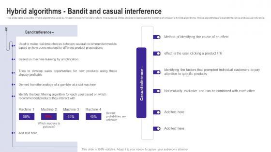 This slide talks about the hybrid algorithms used by Amazons recommender system. The purpose of this slide is to represent the working of Amazons hybrid algorithms. These algorithms are Bandit inference and casual inference. Presenting this PowerPoint presentation, titled Recommendation Techniques Hybrid Algorithms Bandit And Casual Interference Download PDF, with topics curated by our researchers after extensive research. This editable presentation is available for immediate download and provides attractive features when used. Download now and captivate your audience. Presenting this Recommendation Techniques Hybrid Algorithms Bandit And Casual Interference Download PDF. Our researchers have carefully researched and created these slides with all aspects taken into consideration. This is a completely customizable Recommendation Techniques Hybrid Algorithms Bandit And Casual Interference Download PDF that is available for immediate downloading. Download now and make an impact on your audience. Highlight the attractive features available with our PPTs. This slide talks about the hybrid algorithms used by Amazons recommender system. The purpose of this slide is to represent the working of Amazons hybrid algorithms. These algorithms are Bandit inference and casual inference.