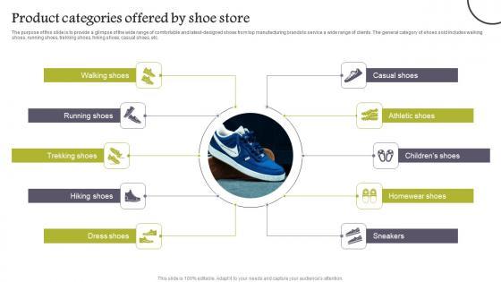 The purpose of this slide is to provide a glimpse of the wide range of comfortable and latest designed shoes from top manufacturing brands to service a wide range of clients. The general category of shoes sold includes walking shoes, running shoes, trekking shoes, hiking shoes, casual shoes, etc. There are so many reasons you need a Product Categories Offered Company Analysis Of Shoe Store Background Pdf. The first reason is you can not spend time making everything from scratch, Thus, Slidegeeks has made presentation templates for you too. You can easily download these templates from our website easily. The purpose of this slide is to provide a glimpse of the wide range of comfortable and latest designed shoes from top manufacturing brands to service a wide range of clients. The general category of shoes sold includes walking shoes, running shoes, trekking shoes, hiking shoes, casual shoes, etc.