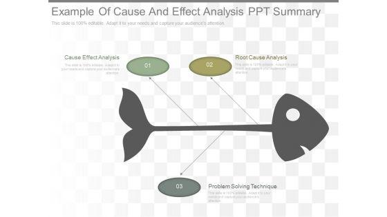 This is a example of cause and effect analysis ppt summary. This is a three stage process. The stages in this process are cause effect analysis, problem solving technique, root cause analysis.