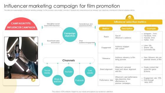 This slide showcases sample of influencer marketing campaign for film promotion using multiple channels. It highlights key components such as campaign type, objectives, channels and influencer selection metrics. Explore a selection of the finest Marketing Channels For Movie Influencer Marketing Campaign For Film Promotion Strategy SS V here. With a plethora of professionally designed and pre-made slide templates, you can quickly and easily find the right one for your upcoming presentation. You can use our Marketing Channels For Movie Influencer Marketing Campaign For Film Promotion Strategy SS V to effectively convey your message to a wider audience. Slidegeeks has done a lot of research before preparing these presentation templates. The content can be personalized and the slides are highly editable. Grab templates today from Slidegeeks. This slide showcases sample of influencer marketing campaign for film promotion using multiple channels. It highlights key components such as campaign type, objectives, channels and influencer selection metrics.